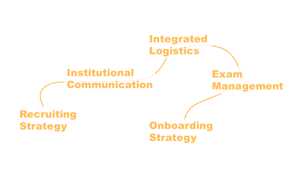 Integrated Logistics. Location Identification e analisi di fattibilità. Applicazione dei protocolli di Risk Prevention. Supply Chain Management forniture, servizi e lavori. Gestione degli spazi e della workforce. Gestione dei flussi e della sicurezza. Accoglienza e identificazione candidati. Gestione sistemi di anonimizzazione prove.